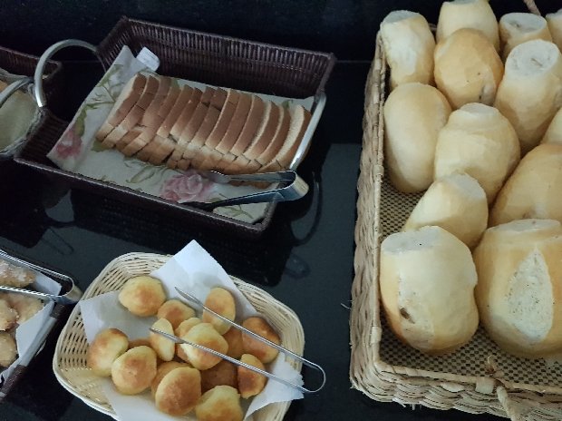 O Café da manhã é bom, com três tipos de pães, ovos mexidos, frutas, sucos, café, leite, cereais, mel, etc. com uma área ampla e funcionários bem simpáticos.