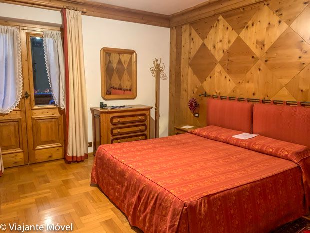 Por dentro o hotel parece um grande casarão com vários quartos. Os quartos são bem confortáveis, com um estilo cabana na montanha, com piso de madeira, muito legal. Nosso quarto tinha uma varanda com vista para a cidade, com as Dolomitas ao fundo. O hotel também tem um spa com sauna, banho turco e uma banheira de hidromassagem.