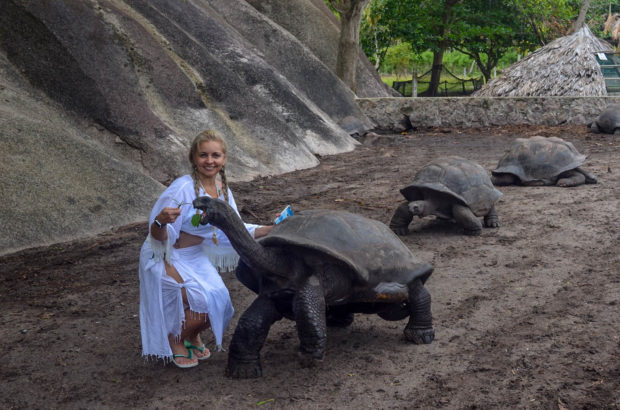 Uma das atrações mais legais é a criação das famosas Tartarugas Gigantes de Seychelles, também conhecidas como Tartarugas Gigantes de Aldabra. Elas vivem numa área protegida por uma mureta baixa, mas os turistas podem entrar, chegar perto, tocar nelas, alimentá-las e, claro, tirar fotos inesquecíveis. Os funcionários deixam várias folhas sobre a mureta justamente para os turistas alimentarem-nas. Muito legal e para as crianças então, uma experiência inesquecível, pois os “bichinhos” são realmente gigantes!!! :):):)