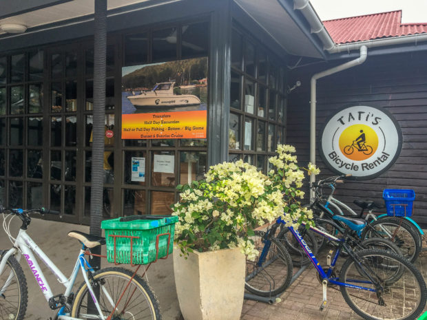 Em La Digue não precisa alugar carro, eles nem têm carros pra alugar lá. Ao invés disso, alugue uma bicicleta. A ilha é pequena, dá pra se locomover tranquilamente de bike, além de ser muito agradável rodar pela ilha sentindo a brisa no rosto e apreciando lugares lindos. O Le Domaine de L’Orangeraie tinha bicicletas para alugar mas alugamos na Tati’s Bicycle Rental por ser mais barato. Há vários serviços de aluguel de bicicletas pela área do comércio central da ilha, perto de onde fica o Le Domaine. É possível encontrar bicicletas normais, aro 16, 20, 24 e 26, além de bicicletas triciclo, para quem não sabe andar na normal (ou sabe mas não quer arriscar atropelar ninguém, como foi o caso rsrsrs) e bicicletas Tandem, aquelas para duas pessoas pedalando juntas.
