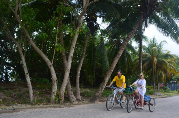 Em La Digue não alugamos carro pois simplesmente não precisa, já que a ilha é pequena. Ao invés disso, aluguamos umabicicleta. Dá pra se locomover tranquilamente de bike ou até mesmo a pé, e do hotel Le Domaine L’Orangerie dá pra ir de bike à praia mais bonita do mundo, Anse Source D’Argent. Pra quem gosta de andar, também dá pra ir tranquilamente a pé.