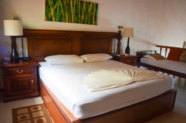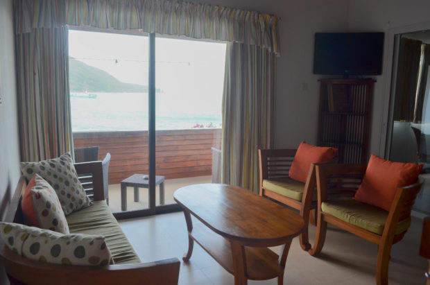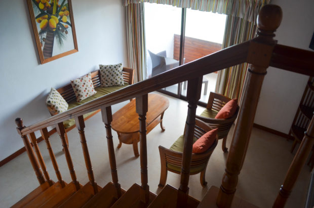 O hotel que escolhemos em Praslin foi o Chalets Coté Mer, avaliado como “Muito Bom” no booking.com. O apartamento era na verdade um chalé de dois andares, com dois quartos, cozinha, sala e varanda. Tinha geladeira, fogão, louças, armários, TV, ventilador, muito agradável e bem estruturado.