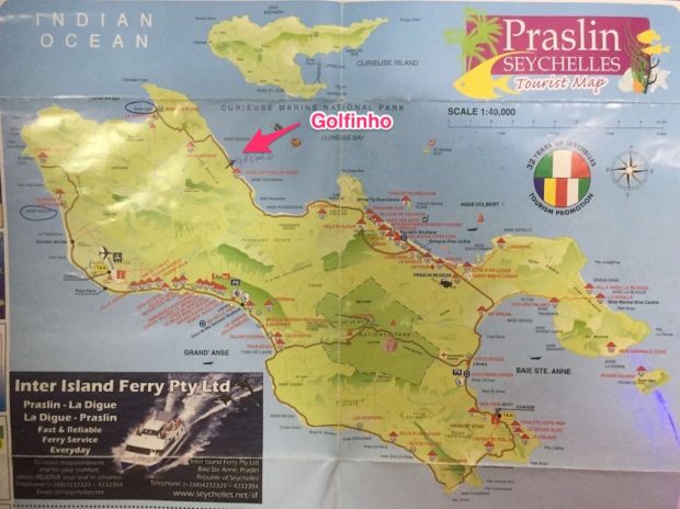 Esse folheto com o mapa vocês pegam logo na chegada no aeroporto de Vitória ou no de Praslin. Por isso que, embora a imagem não esteja muito boa, dá pra vocês terem uma ideia da localização quando tiverem o folheto em mãos. Ele tem os mapas das três ilhas, com vários pontos e dicas legais.