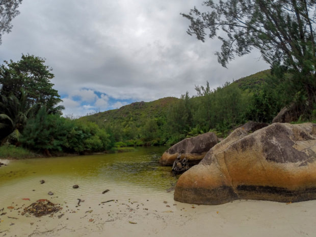 No fim da estrada, pela costa leste, chegamos em Anse Lazio. Essa é uma praia muito bonita, com águas calmas, areia branca, e é um ponto onde o rio se encontra com o mar, então criou-se um cenário lindo, confiram.