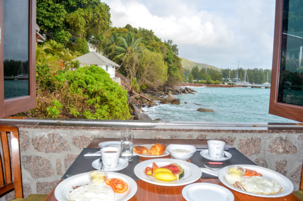 O restaurante onde é servido o café tem uma linda vista da Baie Ste. Anne, de onde se pode ver os barcos chegando e saindo para as outras ilhas. As janelas são bem grandes, o local é bem arejado, mas o mais interessante eram as pequenas companhias que tínhamos: os passarinhos! Isso mesmo, eles estão bem acostumados aos humanos, e chegam bem perto, só não pousam na mesa enquanto você estiver lá. As funcionárias que atendem no café da manhã são super atenciosas e simpáticas.